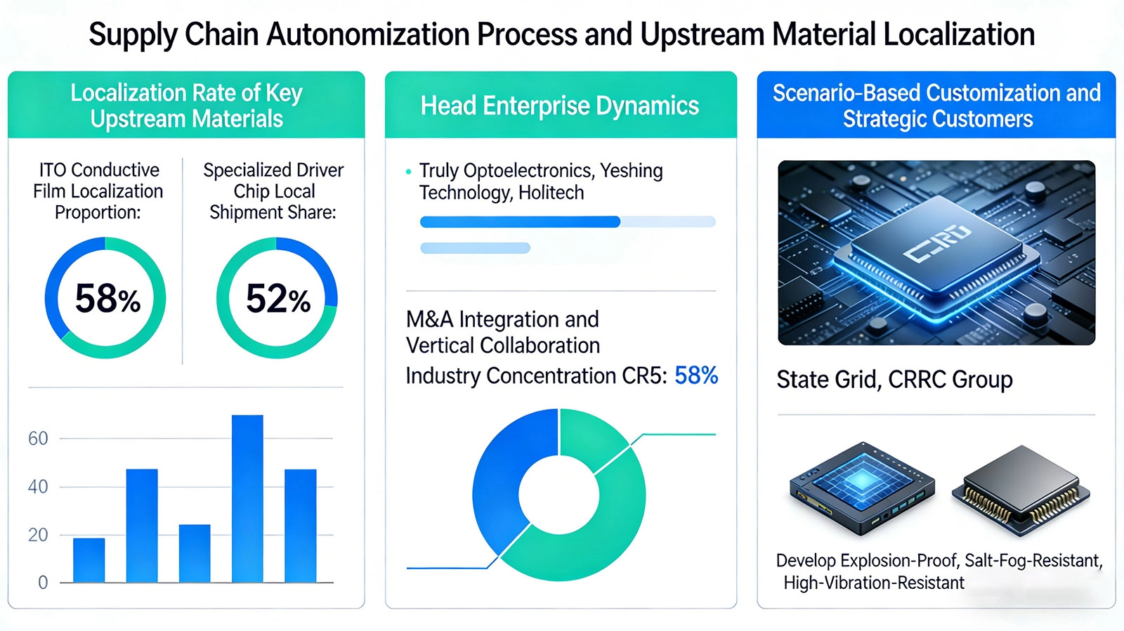 Le processus d'autosuffisance de la chaîne d'approvisionnement s'accélère, le taux de localisation des matières premières clés en amont augmentant régulièrement. Le taux de production nationale de films conducteurs ITO a atteint 58 %, et la part des livraisons nationales de puces de commande dédiées a dépassé 52 %. Des entreprises leaders telles que Truly Optoelectronics, GE Electronics et Holitech ont porté la concentration du secteur (CR5) à 58 % grâce à des fusions-acquisitions et à la synergie verticale, se forgeant ainsi un avantage concurrentiel majeur en matière d'innovation technologique et de maîtrise des coûts. Parallèlement, ces entreprises privilégient la personnalisation en fonction des besoins, développant des modules spéciaux antidéflagrants, résistants au brouillard salin et aux fortes vibrations pour des clients stratégiques comme State Grid et CRRC, renforçant ainsi la valeur ajoutée de leurs produits.