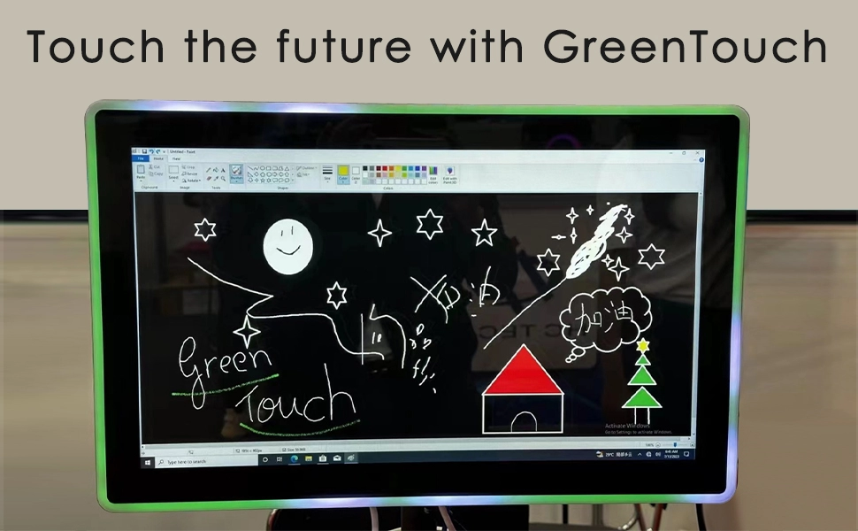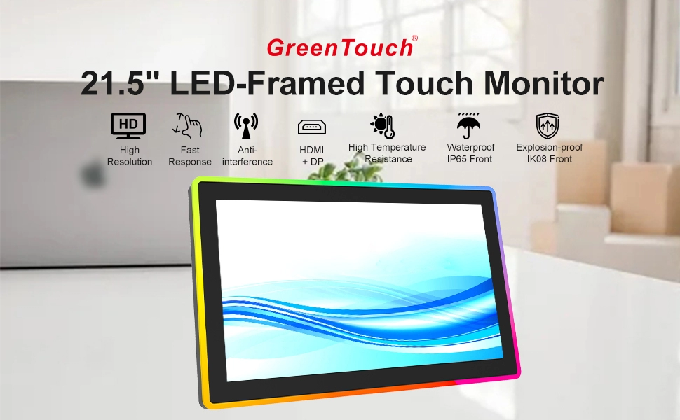 GreenTouch a développé un moniteur tactile unique et performant, principalement destiné aux espaces commerciaux. Cet écran est actuellement disponible en quatre tailles standard : 21,5", 27", 32" et 43". Son contour arbore un design moderne et coloré avec un bandeau lumineux LED, et il est équipé d'une télécommande pour le réglage de la luminosité. Les utilisateurs peuvent facilement choisir parmi une variété de modes de clignotement RGB à sept couleurs (rouge, vert, bleu, blanc, jaune, orange, violet), avec une prise en charge de 358 motifs lumineux différents. Les options de personnalisation incluent la synthèse des couleurs, la vitesse, la direction et la séquence. L'écran utilise une dalle TFT LCD haute définition, une technologie tactile capacitive sensible et un écran LED industriel d'origine de qualité A+. Il est compatible avec les systèmes Windows, Android et Linux.